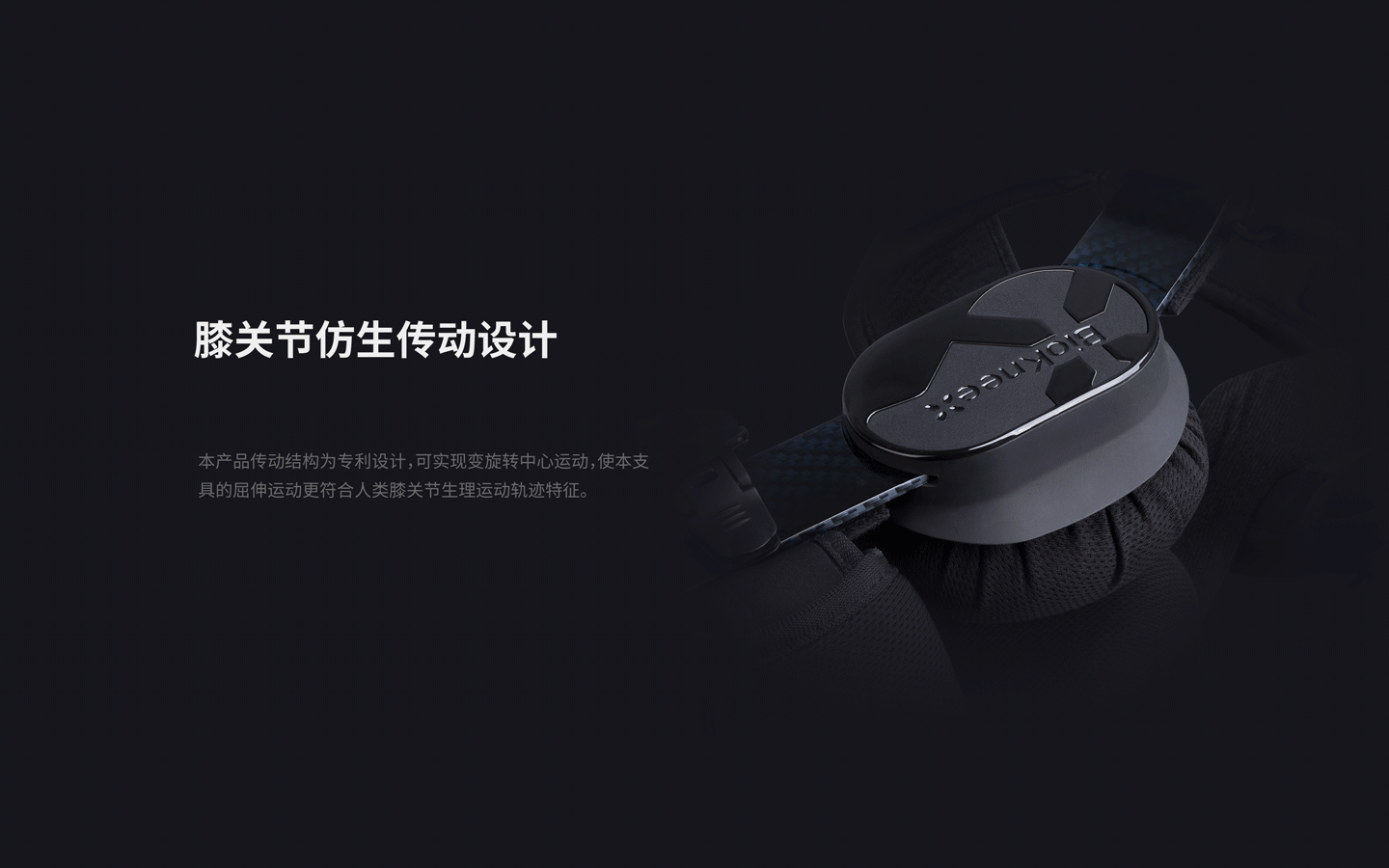 本产品传动结构为专利设计,可实现变旋转中心运动,使本支具的屈伸运动更符合人类膝关节生理运动轨迹特征。