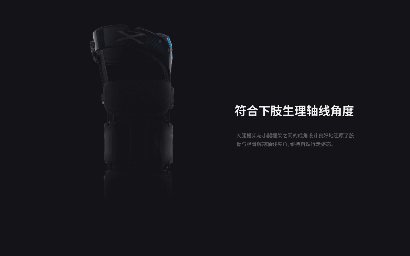 大腿框架与小腿框架之间的成角设计良好地还原了股骨与胫骨解剖轴线夹角,维持自然行走姿态。