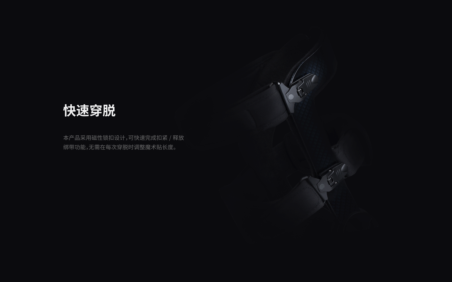 本产品采用磁性锁扣设计,可快速完成扣紧/释放绑带功能,无需在每次穿脱时调整魔术贴长度。