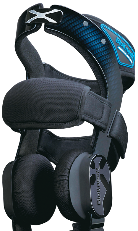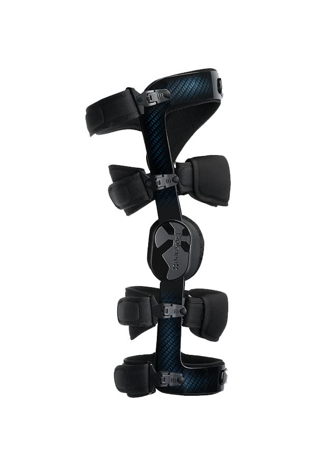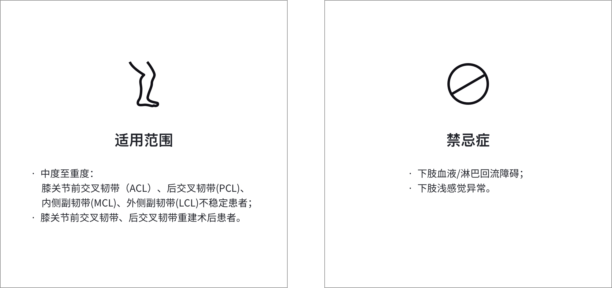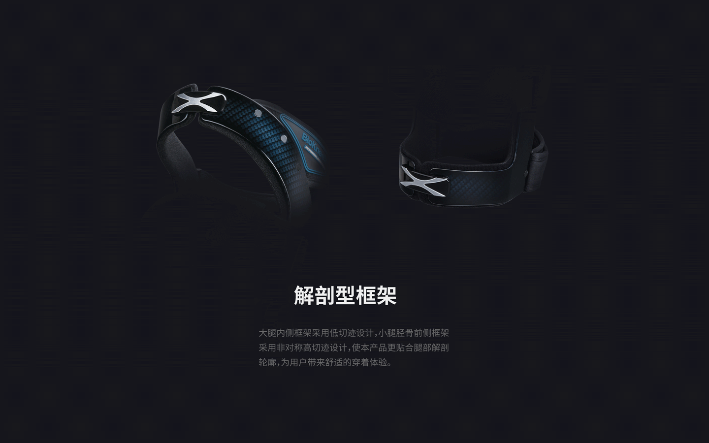 大腿内侧框架采用低切迹设计,小腿胫骨前侧框架采用非对称高切迹设计,使本产品更贴合腿部解剖轮廓,为用户带来舒适的穿着体验。